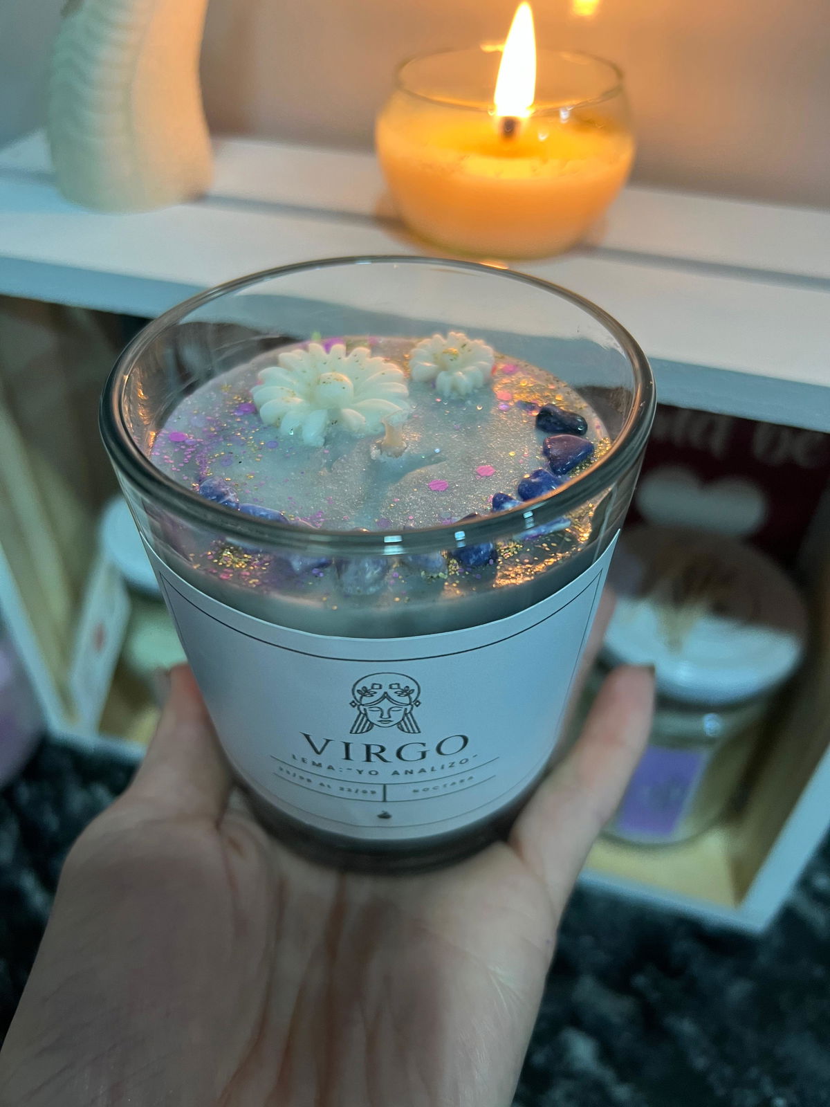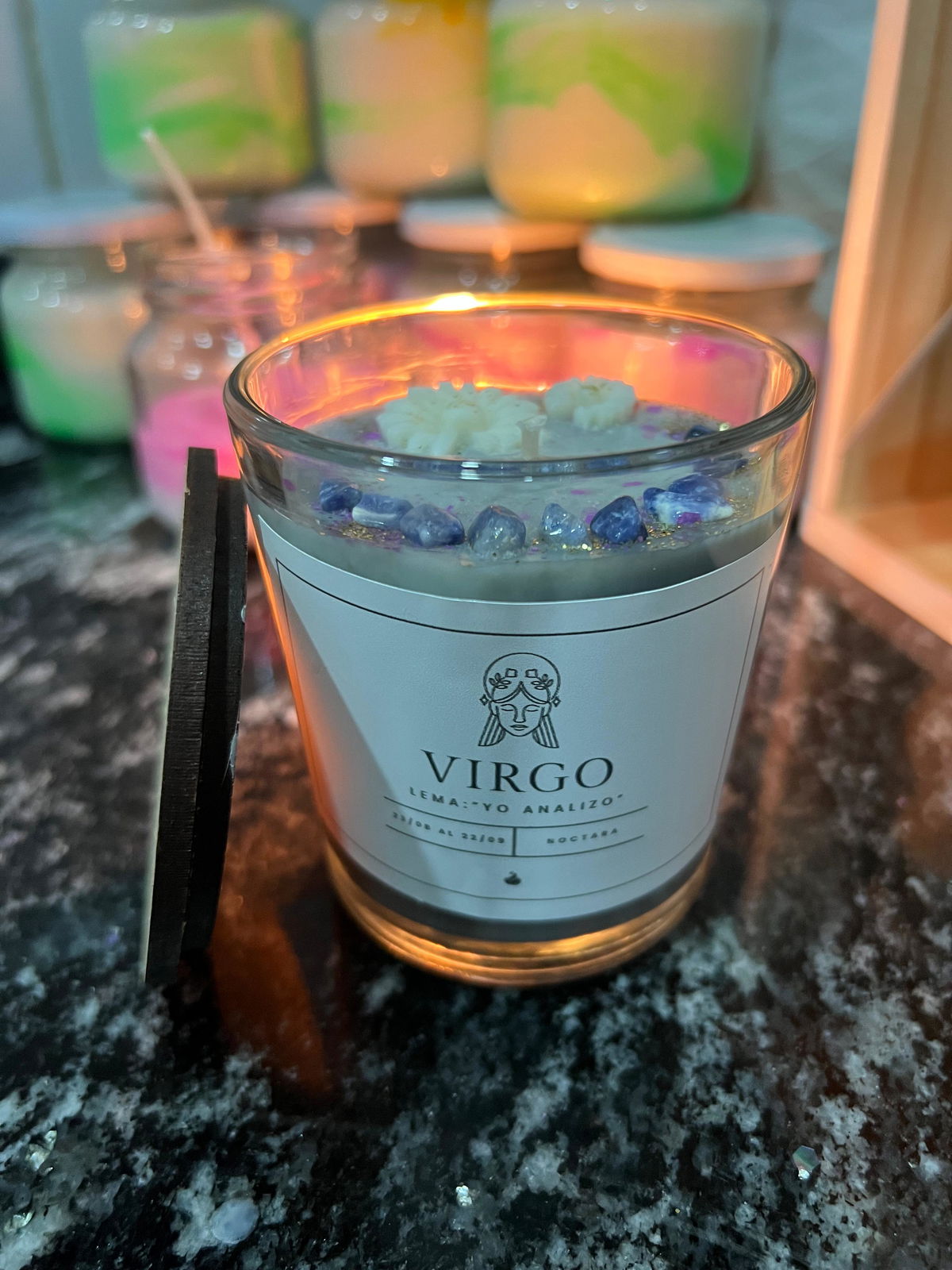 Cera Gris con destellos en dorado y margaritas blancas que florecen en pureza y piedra Lapislázuli que guía hacia la verdad interior.